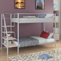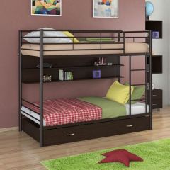 Кровать комплектуется вместительным выкатным ящиком для постельного белья или других вещей. Над нижним спальным местом располагается полка, на которой удобно разместить книги или аксессуары.