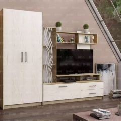 Гостиная Дарья – это компактная стенка, которая ничем не уступает по вместительности большим гарнитурам. На стеклянном фасаде стеллажа нанесен интересный волнообразный орнамент. ТВ-тумба включает в себя одну большую секцию, в которой легко поместятся все необходимые для тв зоны атрибуты. Вместительный шкаф с перегородкой. Одна секция шкафа представляет собой отдел с полками, а во второй расположена выдвижная штанга под одежду.