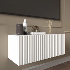 Благодаря своей компактности тумба под ТВ подвесная поможет сэкономить пространство, избежать ощущения загромождённости гостиной, спальни или детской комнаты, а рифлёный фасад будет акцентировать