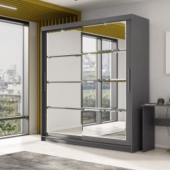 Внутреннее наполнение шкафа включает удобные полки и два выдвижных ящика с одной стороны, а также вместительную платяную секцию с надёжной металлической штангой для одежных вешалок за другой створкой. Нижнеопорная система раздвижных створок обеспечивает лёгкое и ровное открытие.